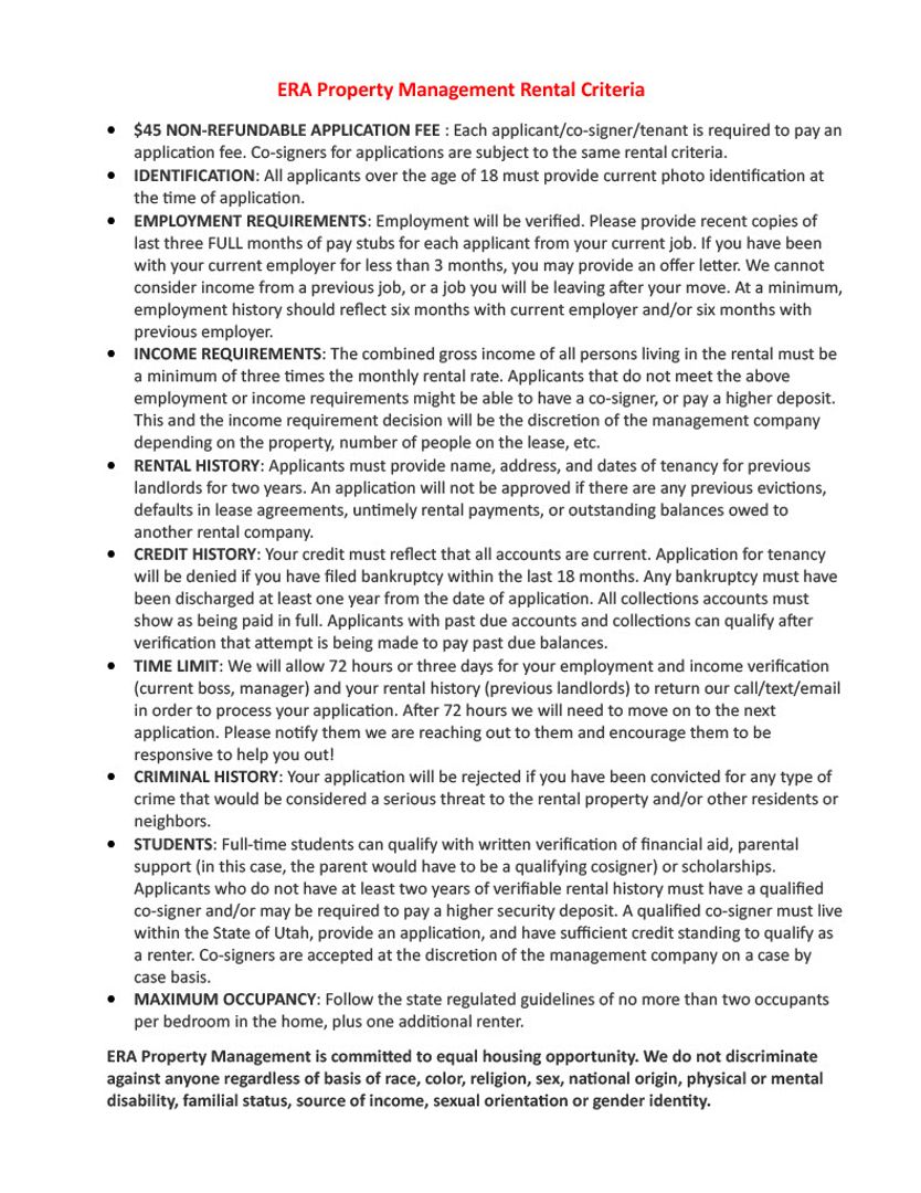 PLEASE NOTE - Any move in delays due to sickness (previous tenant moving out, cleaning vendors, etc.) will be managed in as timely of a fashion as possible. Every effort will be made to accommodate your move in date as close to the expected date as possible, but ERA Property Management will not be held accountable financially for these delays, which we can not prevent.